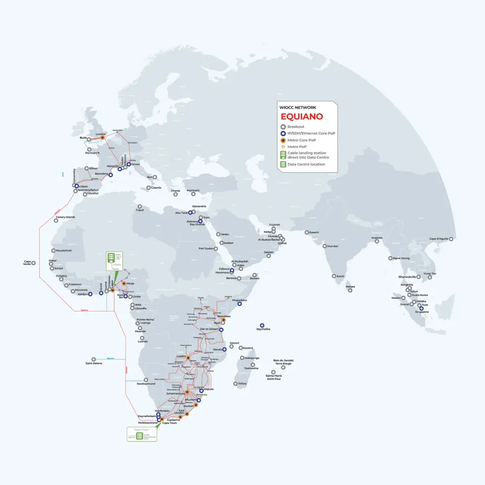 Equiano is a newly constructed, open-access subsea cable system serving Africa’’s western seaboard. Our investment in the cable system enables us to deliver flexible, scalable capacity and spectrum from 1Gbps to 1Tbps. Due to its design and routing, Equiano provides resilience and diversity to our other west coast subsea systems for South African and Nigerian markets.